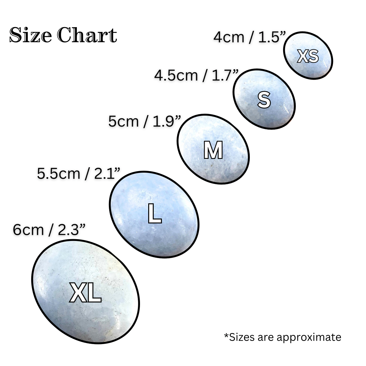 These Blue Calcite Palm Stones from Madagascar come in a variety of light sky blue shades. They have been polished to a high sheen, and are fully opaque. Please use the size chart in the photos and text below as a reference to make your selection. You will receive ONE (1) blue calcite palm stone selected at random- colors, patterns, and shapes vary. Choose from the following sizes:
