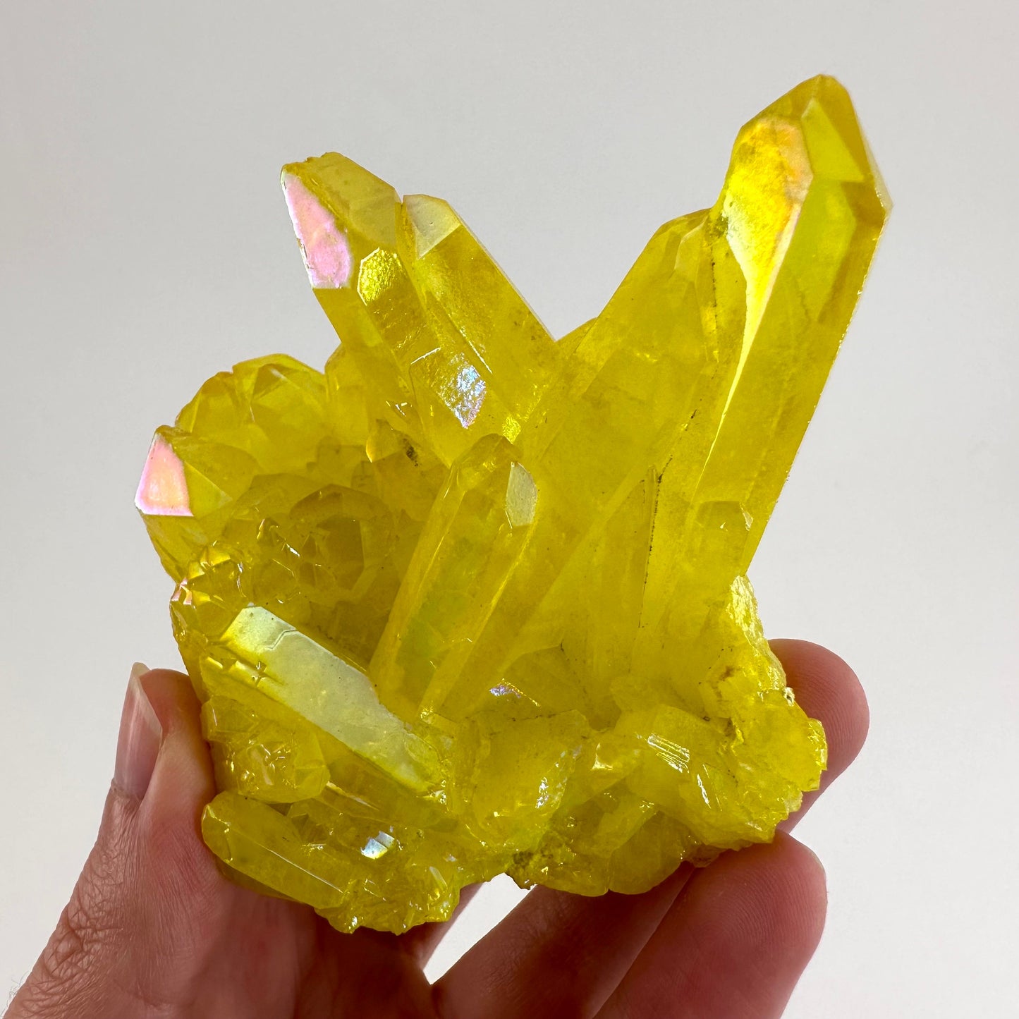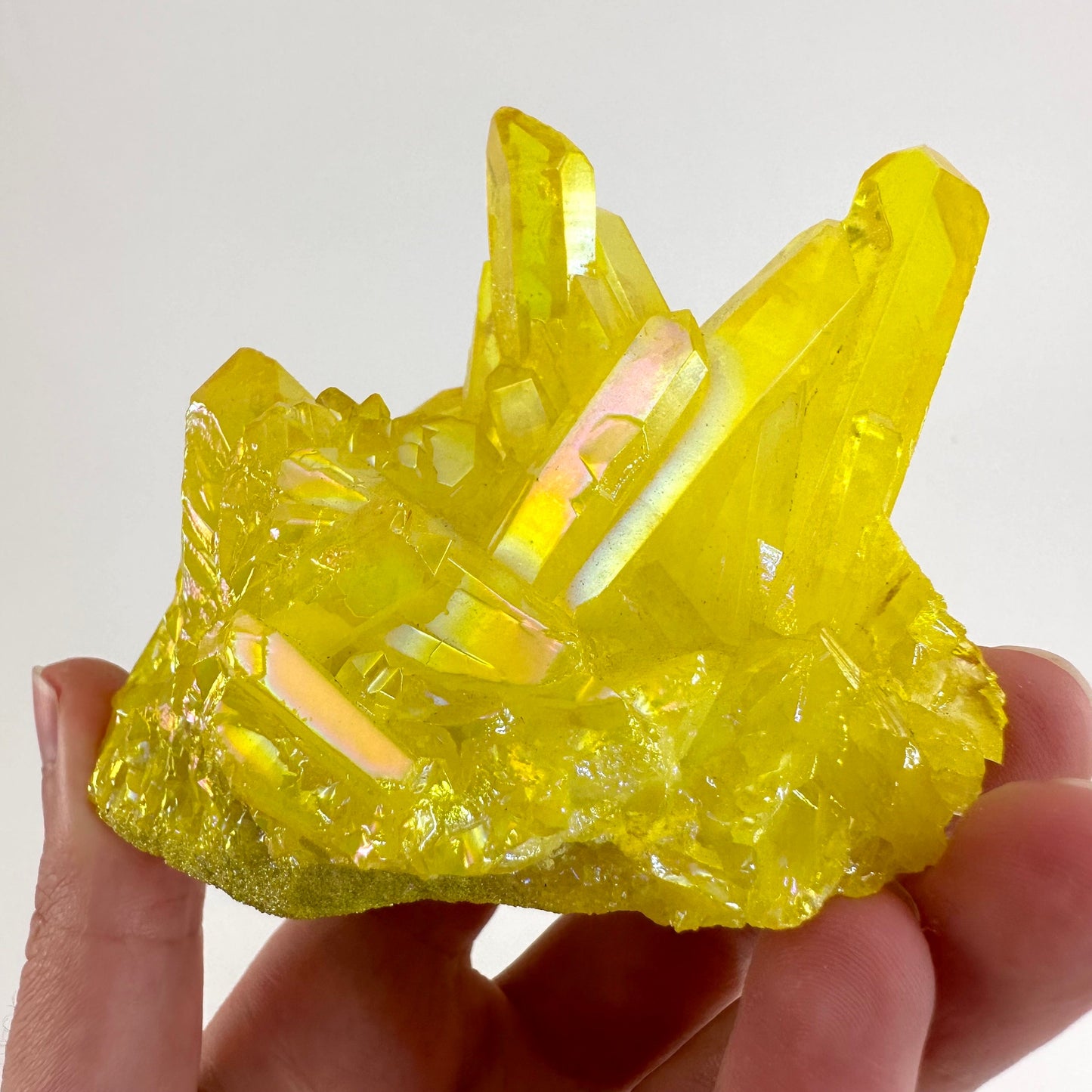 (This quartz is treated with metals to give it the rainbow shimmer, and is artificially colored. The crystal underneath is natural, but the aura coating is not.)