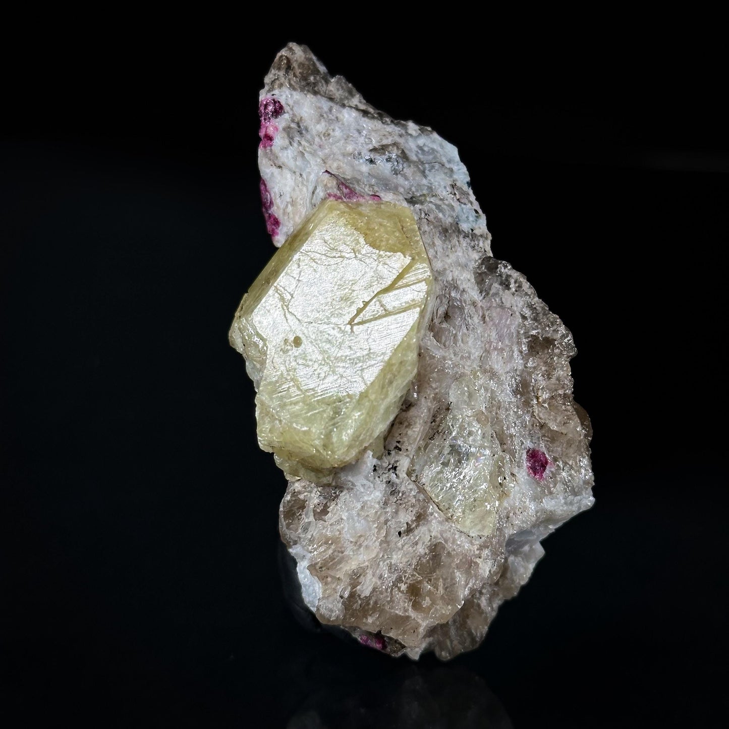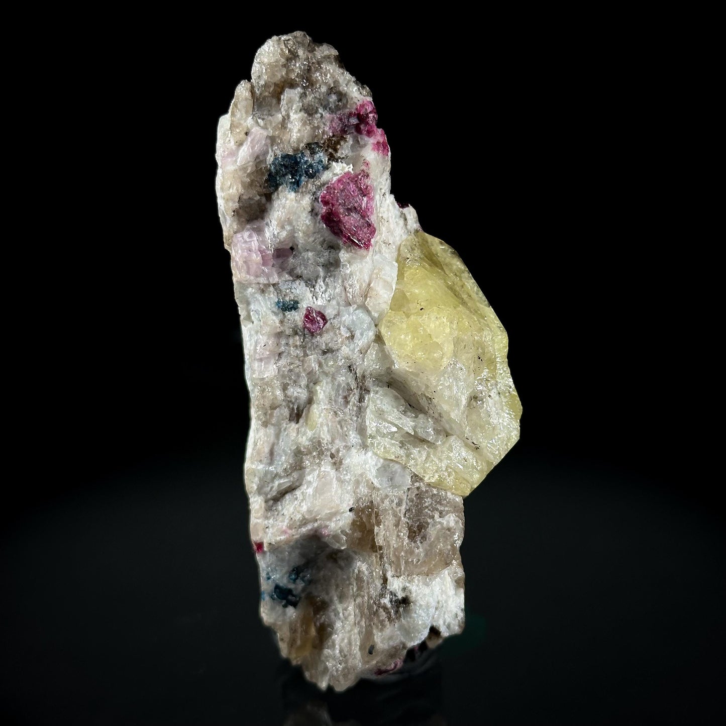 This specimen hosts a banana yellow crystal of the rare species londonite, perched on contrasting white matrix with bits of translucent quartz. The main crystal is 3.4 cm long, fully terminated on one end with some minor etching, and partially terminated on the other, save for a rather large break on the bottom half. It is translucent and sharp, with exceptional luster that is seldom seen on these. The pink and dark blue specks are bits of tourmaline, of the variety liddicoatite.