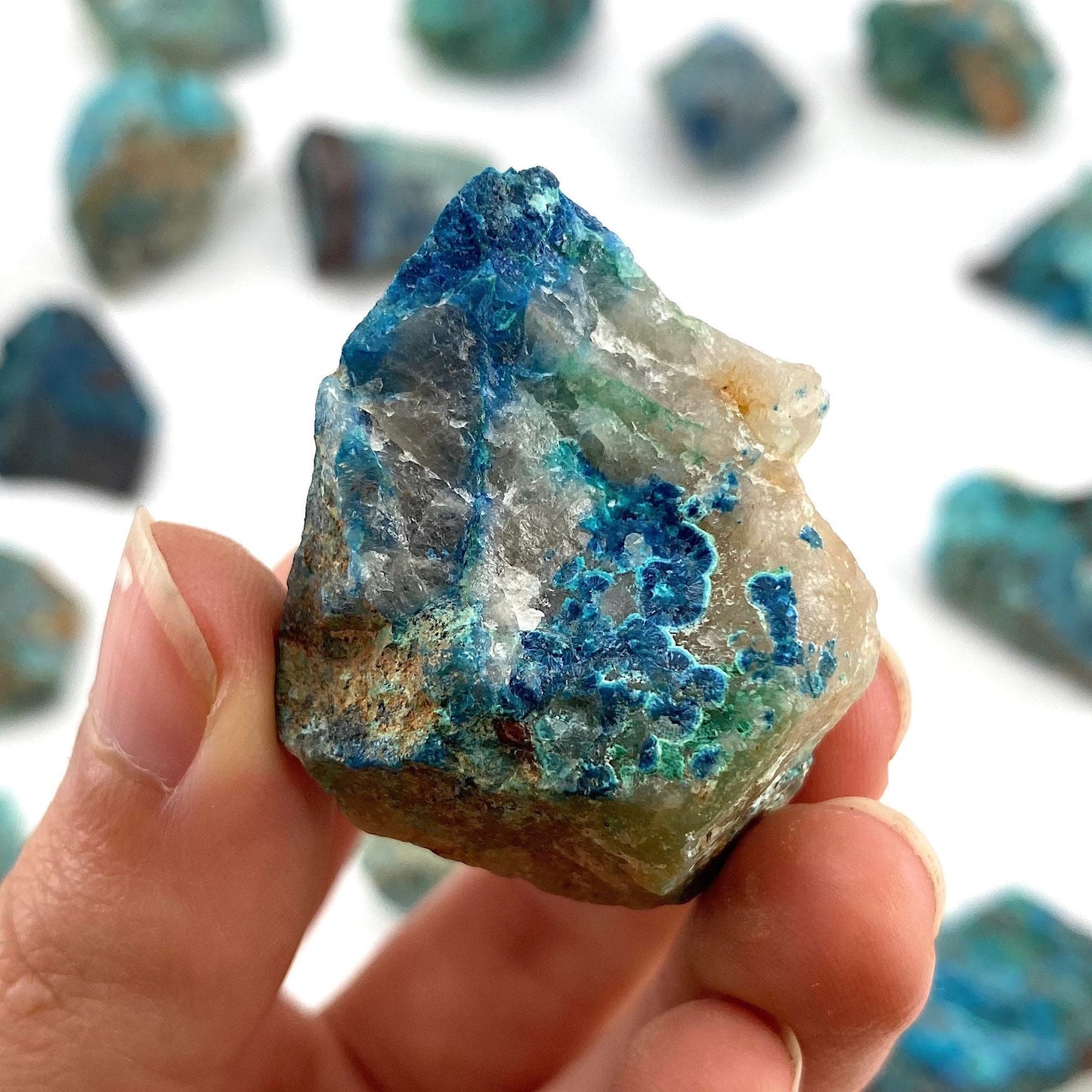 You will receive ONE stone chosen at random. Colors, shapes, and patterns will vary, please look through all the photos to see what kind of variety to expect. Photo #2 shows a rough reference for size. Specimens may contain a mixture of the following: shattuckite, chrysocolla, quartz, & malachite.