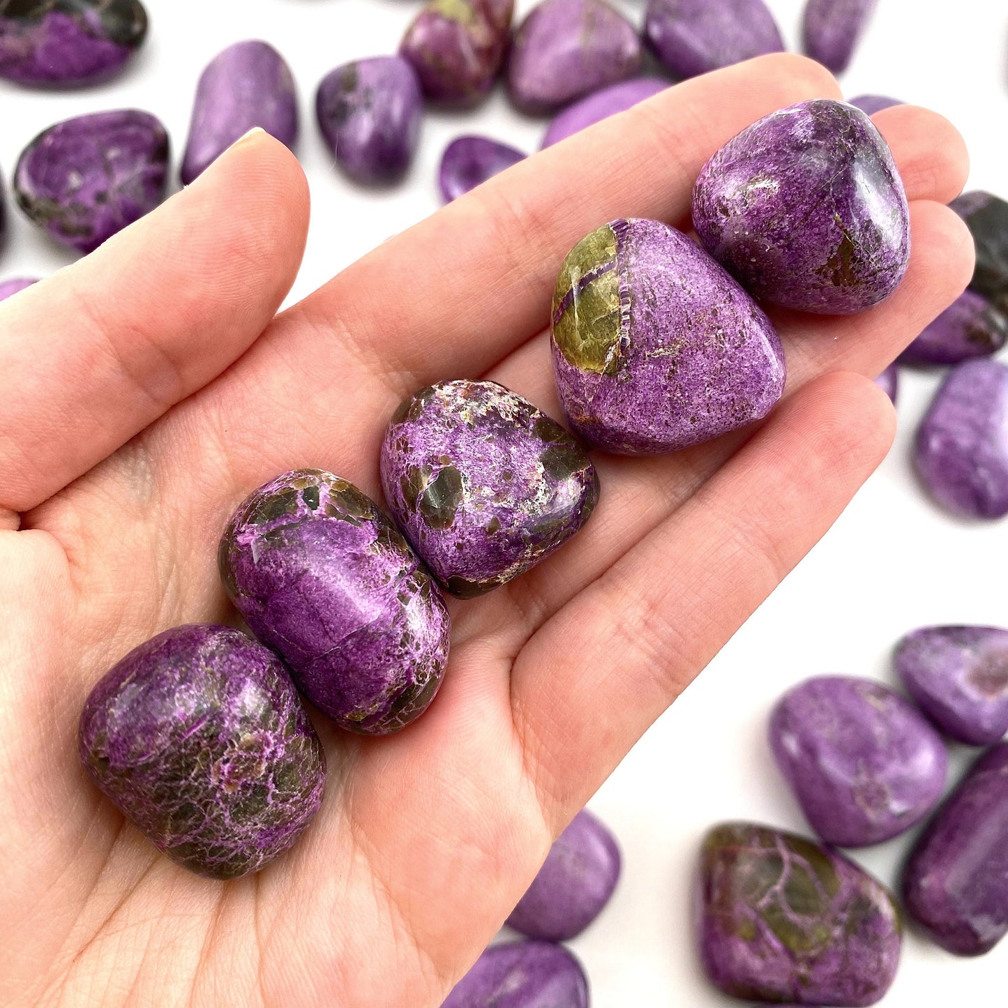 Most pieces contain some serpentine, but these have been selected to be mostly purple stichtite.