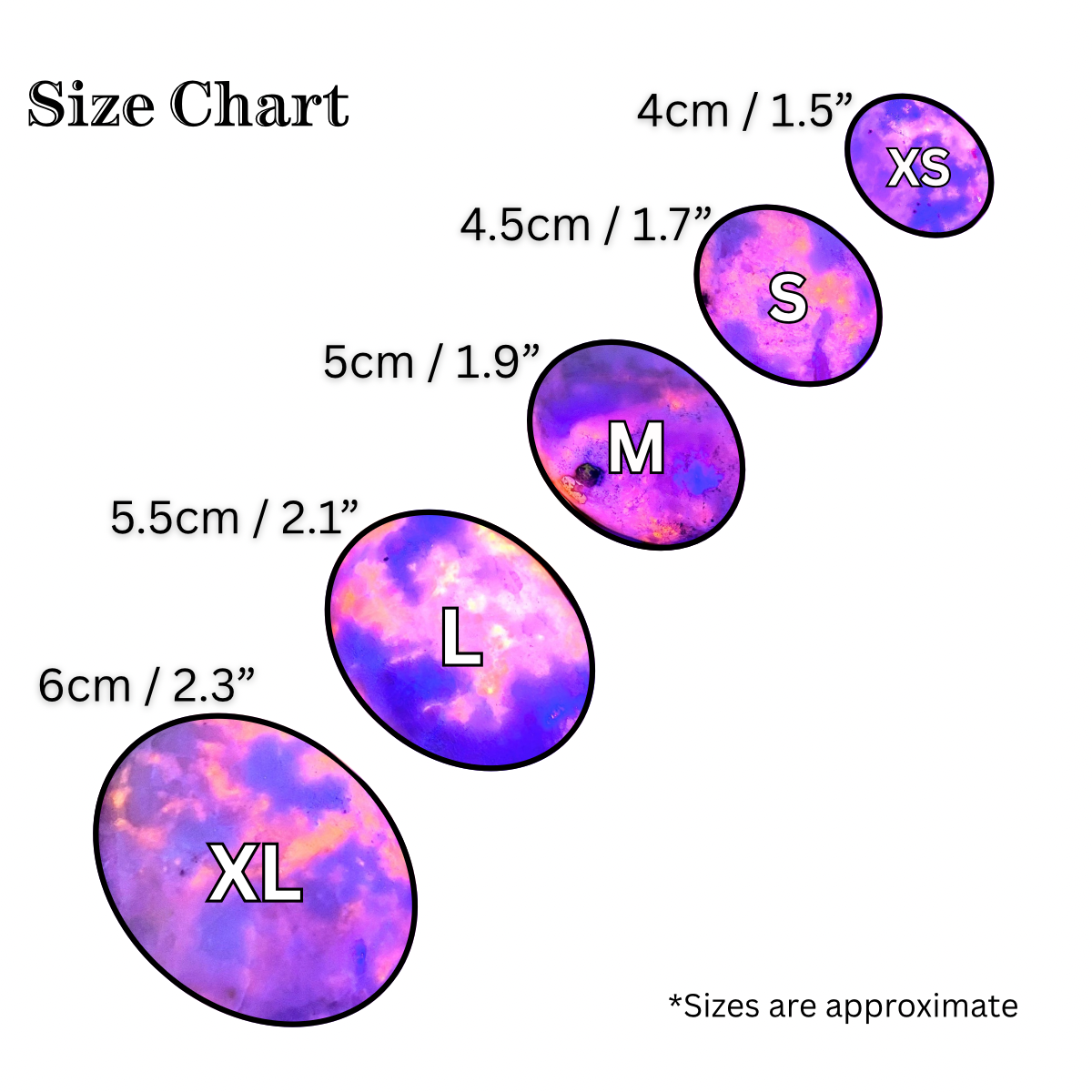 Please use photo #2 as a reference to choose your size. You will receive ONE stone selected at random. Colors, sizes, and shapes vary. The following sizes are a rough guide: