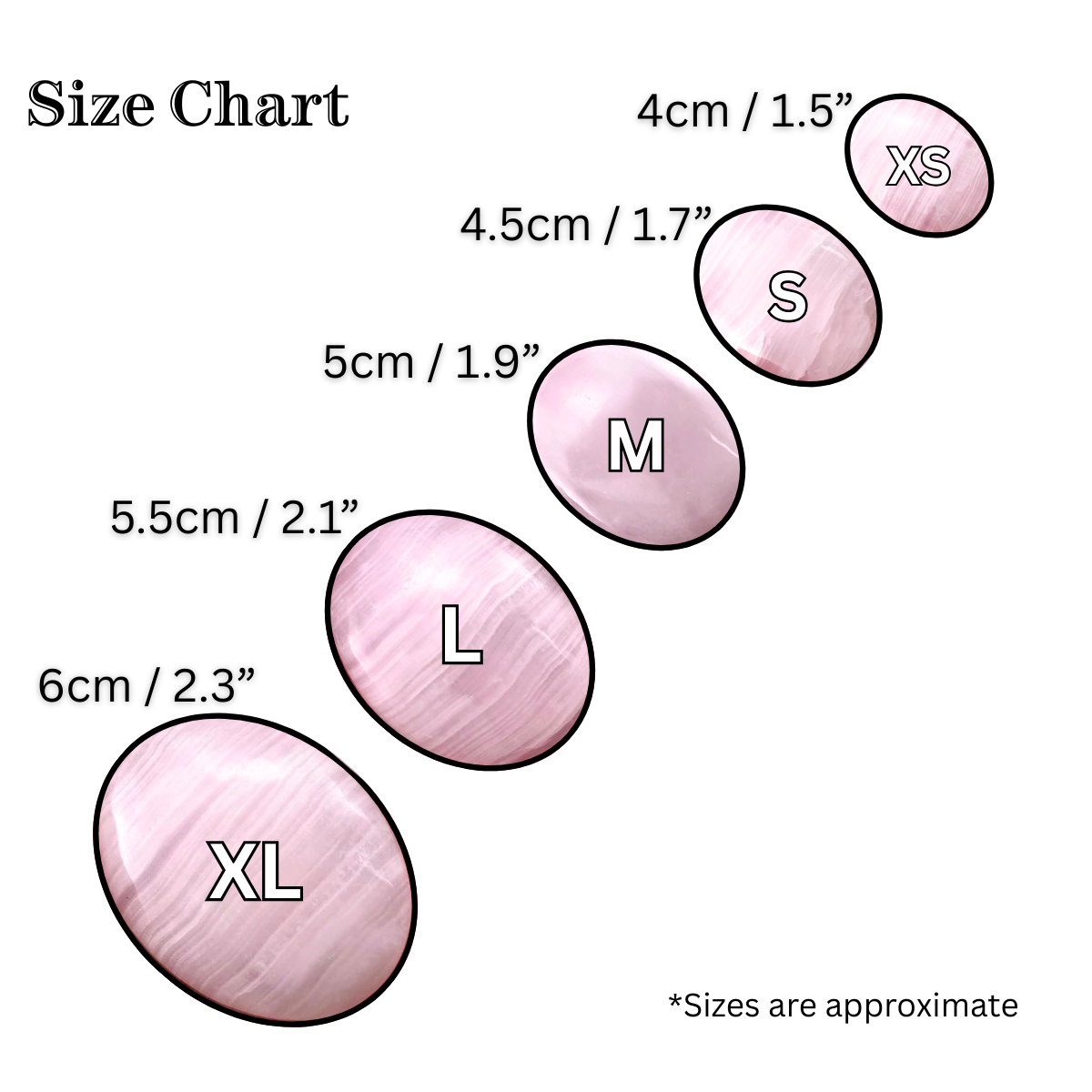 These Pink Mangano Calcite Palm Stones from Pakistan come in a lovely pale shade of pink, and exhibit a soft, glowing translucence with some banding. Please use the size chart in the photos and text below as a reference to make your selection. You will receive ONE (1) mangano calcite palm stone selected at random- colors, patterns, and shapes vary. Choose from the following sizes: